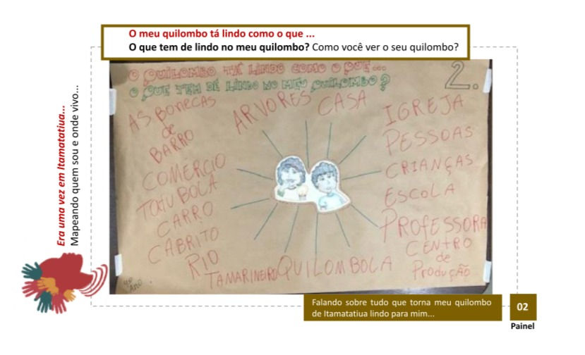 O objetivo da parede de memórias do quilombo foi explorar o mundo dos personagens mediante o compartilhamento das histórias desenvolvidas pelos participantes, tendo em vista suas vidas e experiências no quilombo, ou seja, as histórias do quilombo sob o olhar das crianças. Mas em apenas 3 (três) quadros!